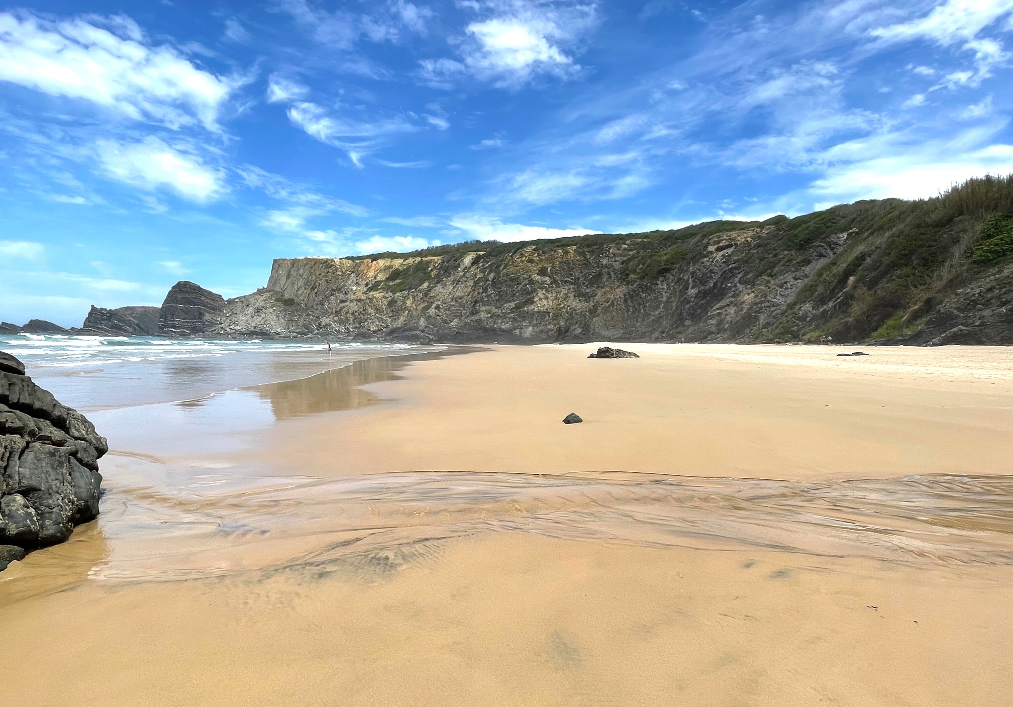 Rund 100 Treppenstufen sind es vom Klippenrand hinunter bis ans Wasser. Es ist Ebbe, der breite Sandstrand der Praia do Brejo Largo, hier und da durchbrochen durch Felsblöcke, reicht bis fast an den Horizont. Schnell streifen wir die staubigen Wanderschuhe ab, laufen barfuß an der Brandung entlang und klettern in die nächste Bucht. Welch ein Glücksgefühl! Das Meerwasser reinigt den verschwitzten Körper, die Frühlingssonne wärmt die Glieder auf, die Atlantikbrise kühlt die Stirn. Ein Möwenschwarm lässt sich von unserem Freudentaumel nicht beeindrucken, kennt das alles schon länger, flattert nur kurz auf und setzt dann seine Muschelsuche fort.